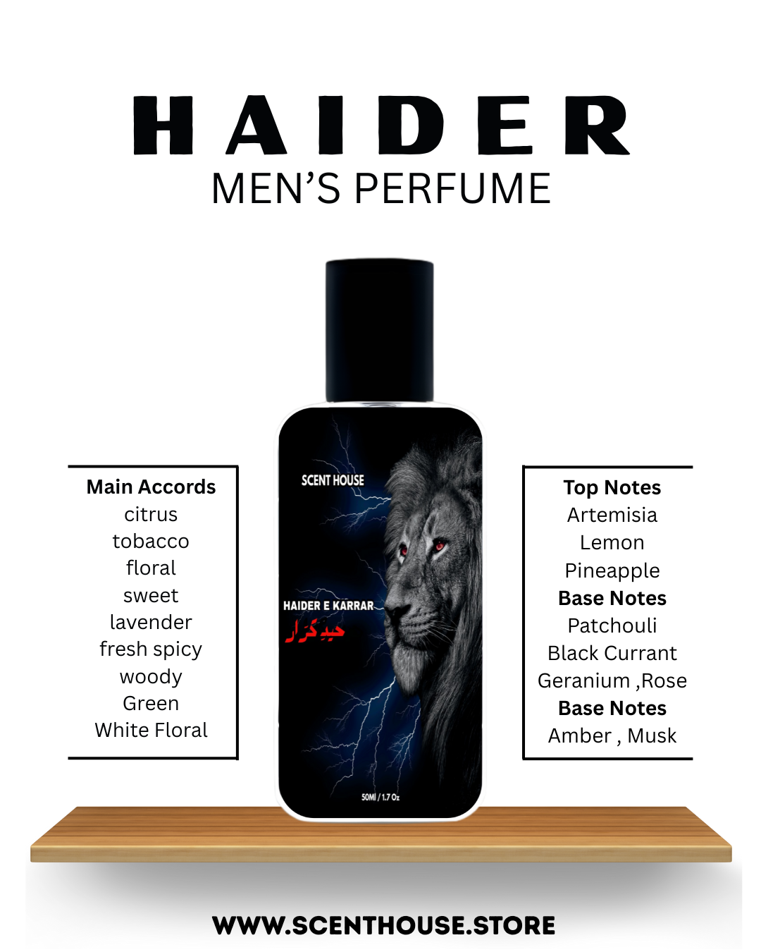 Haider-e-Karrar is a bold and sophisticated fragrance for men who exude confidence and strength. It combines fresh, floral, and woody notes for a well-balanced and lasting scent.