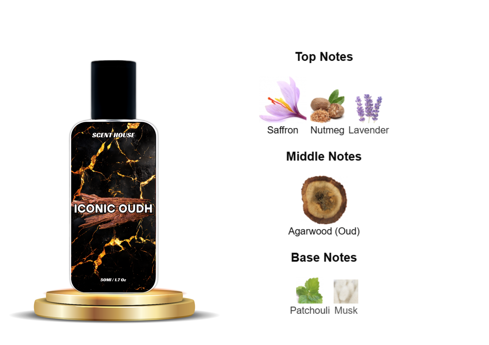The scent opens with a luxurious blend of Saffron, Nutmeg, and Lavender, creating a warm, spicy, and slightly floral introduction. At the heart, the bold and distinctive Agarwood (Oud) adds depth and richness, making the fragrance truly captivating. As it settles, the base notes of Patchouli and Musk provide a smooth, earthy, and long-lasting finish.