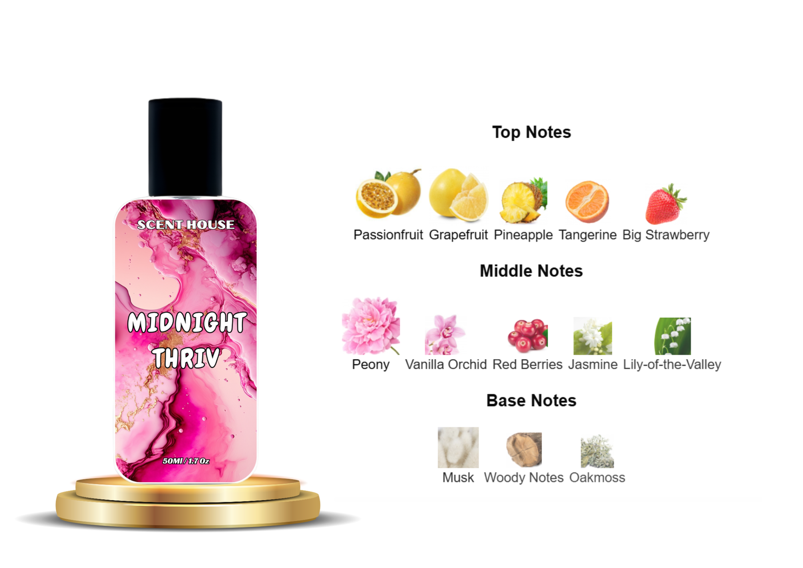 Midnight Thrive is a mesmerizing scent that blends fruity sweetness, delicate florals, and warm musky notes, creating an irresistible fragrance for the modern woman who embraces confidence and elegance.
